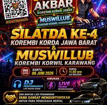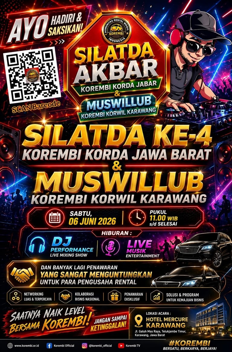KOREMBI Korwil Karawang akan menggelar agenda penting berupa Musyawarah Wilayah Luar Biasa (Muswillub) dan Silaturahmi Daerah (Silatda) ke-4 yang dijadwalkan berlangsung pada 6 Juni 2026 di Mercure Karawang. Kegiatan ini menjadi momentum strategis bagi para pelaku usaha rental mobil di wilayah Karawang dan sekitarnya untuk berkumpul, berdiskusi, serta memperkuat sinergi dalam menghadapi dinamika industri transportasi.